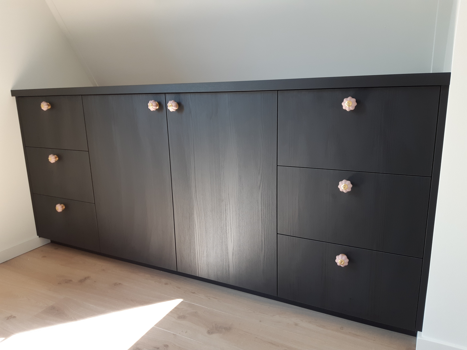 In een babykamer hebben wij dit maatwerk commodemeubel gemaakt van een mat zwart houtnerf-materiaal. Het is volledig op maat gemaakt onder een schuin dak en voorzien van lades en een hanggedeelte met deuren ervoor.