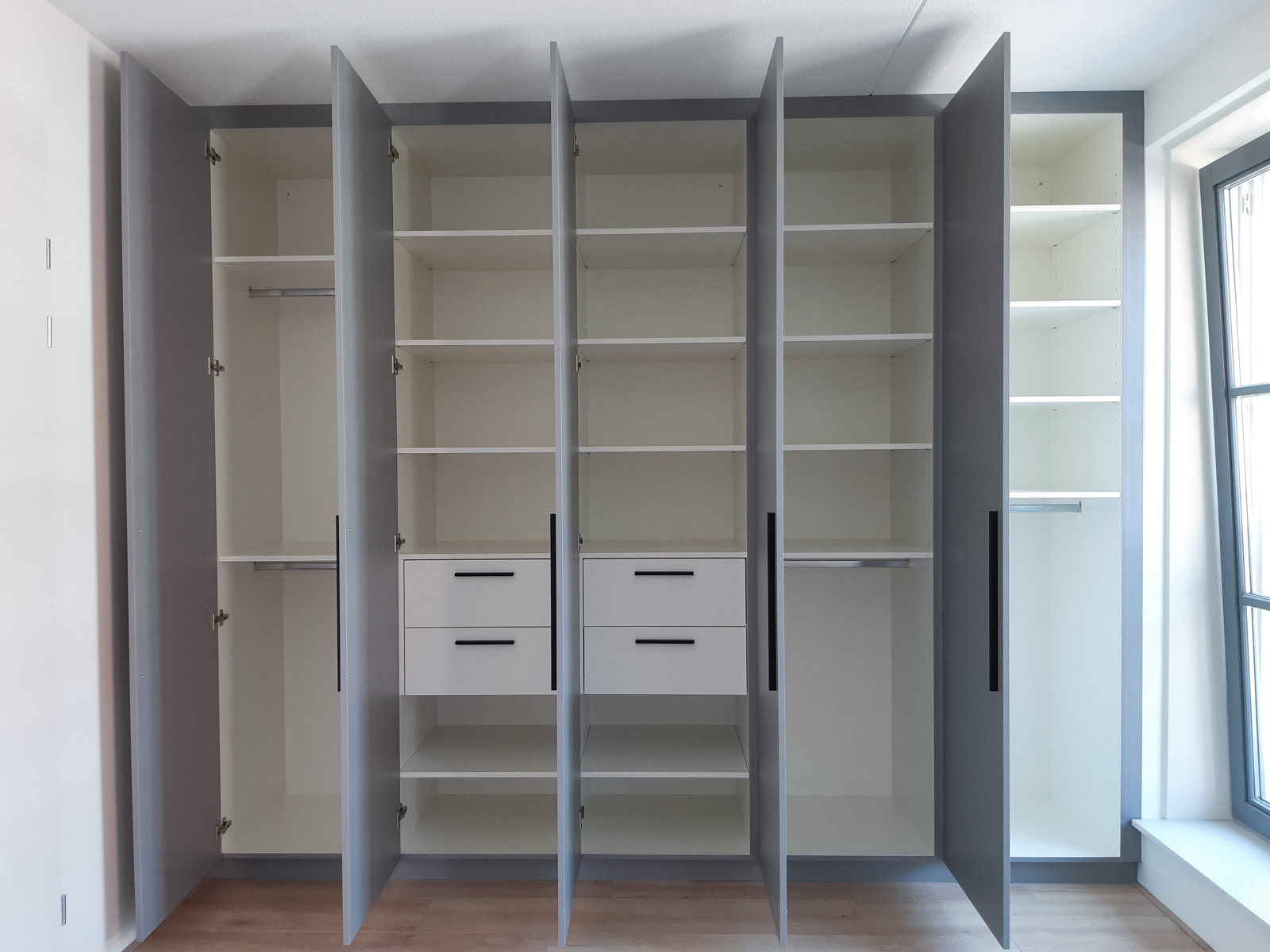 Deze mooie garderobekast heeft een strakke buitenkant en functioneel ingedeelde binnenkant.