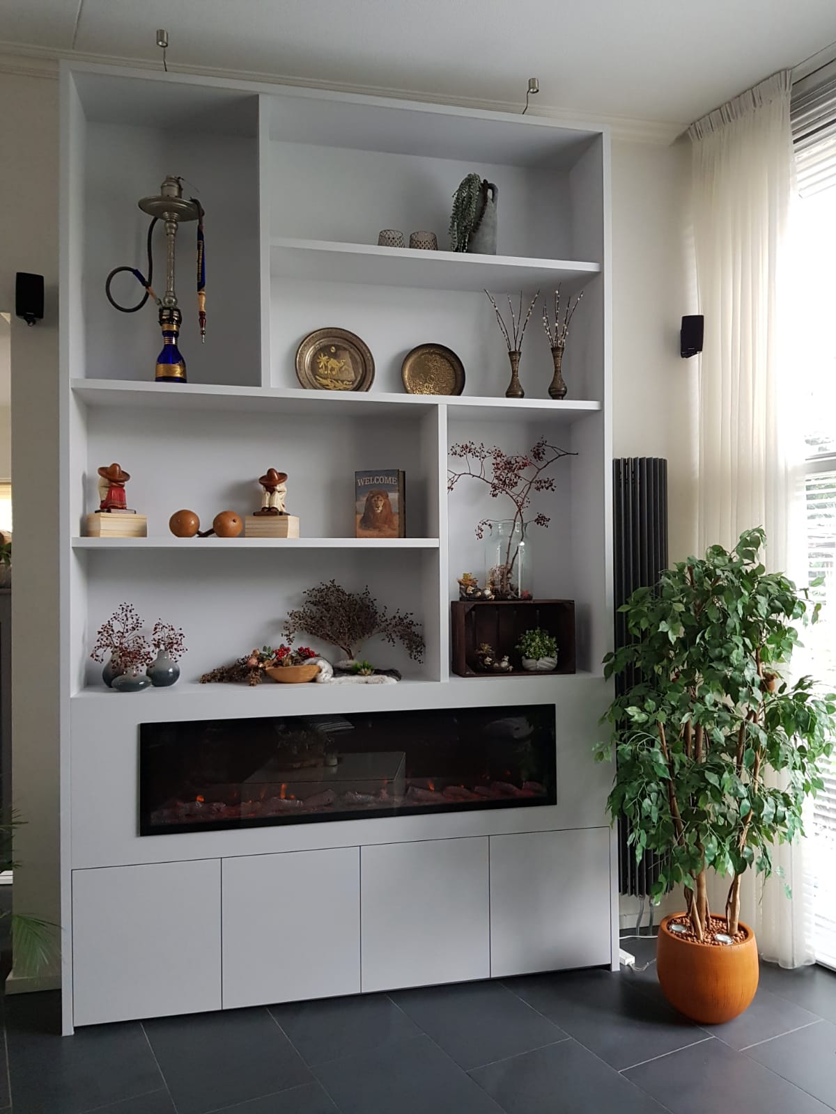 Dit haardmeubel is maar liefst 3m60 hoog! Het is voorzien van een elektrische haard en in een mooie grijstint gespoten.